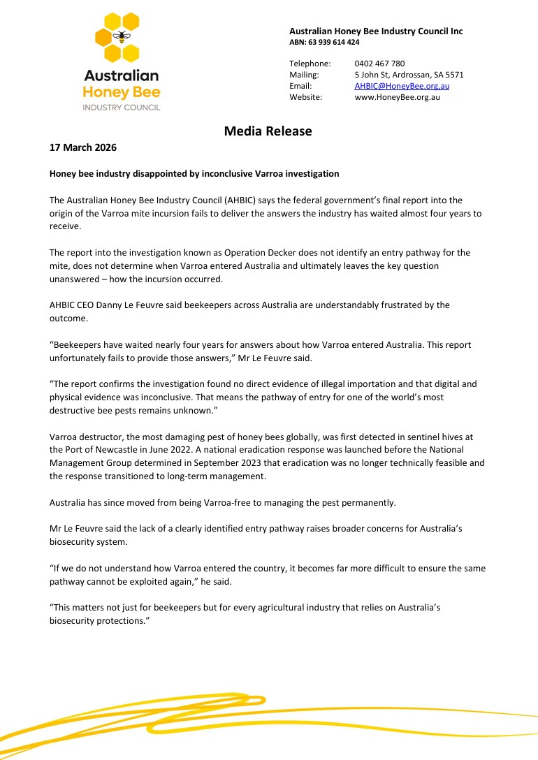 Media Release: Honey bee industry disappointed by inconclusive Varroa investigation