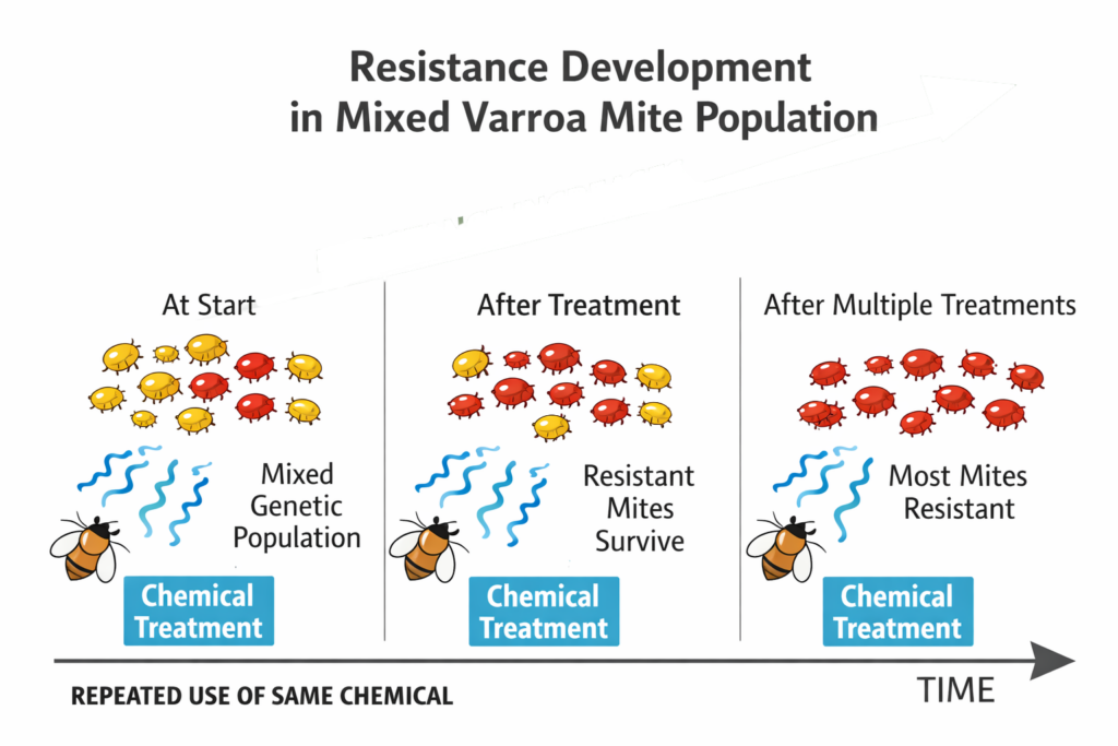 Where resistance can build more rapidly is at the apiary level, particularly where the same chemical group is used repeatedly without rotation and/or without checking whether treatments have actually worked.