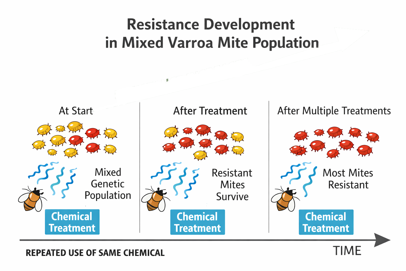 In simple terms, miticide resistance is a genetic survival trait. Within any mite population, there can be a small number of individuals that naturally survive a treatment. When those mites reproduce, they pass that survival trait on to the next generation. Over time—and particularly if the same treatment is used repeatedly—the selection pressure disproportionally increases resistant mites.
